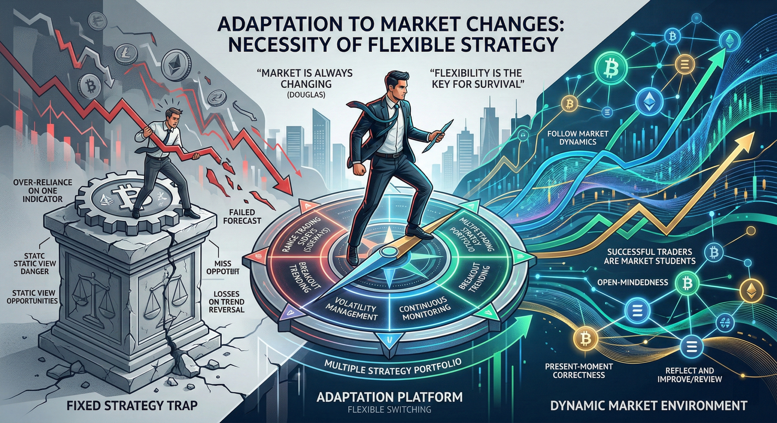 適應市場變化意味著不斷學習和調整。要在市場中打滾必定是要有多種策略組合,例如在震盪市用區間交易,在趨勢時用突破策略等,根據市場狀況靈活切換。這種靈活性可以讓交易者在加密市場中更具競爭力。道格拉斯說,成功的交易者是市場的學生,永遠保持開放的心態。當我學會觀察市場信號而非固執於單一方法時,交易變得更輕鬆,也更有效。