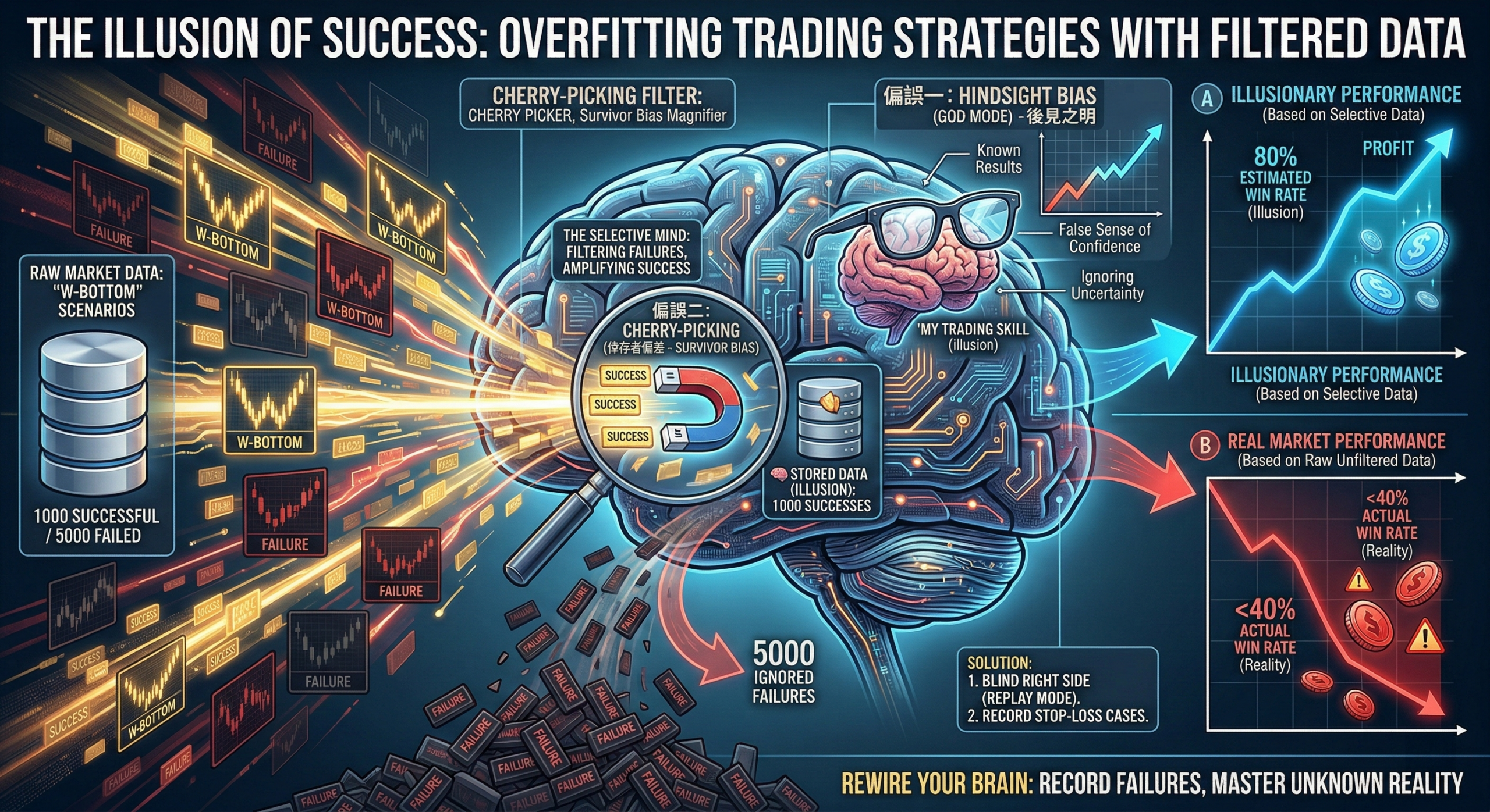 你無意識忽略了 50 次失敗或變形的頭肩底。在統計學上,這叫做「倖存者偏差」。 你的大腦對策略進行了「過度擬合」。 你以為這個策略勝率 80%, 但在真實的隨機分佈中,它可能連 40% 都不到。