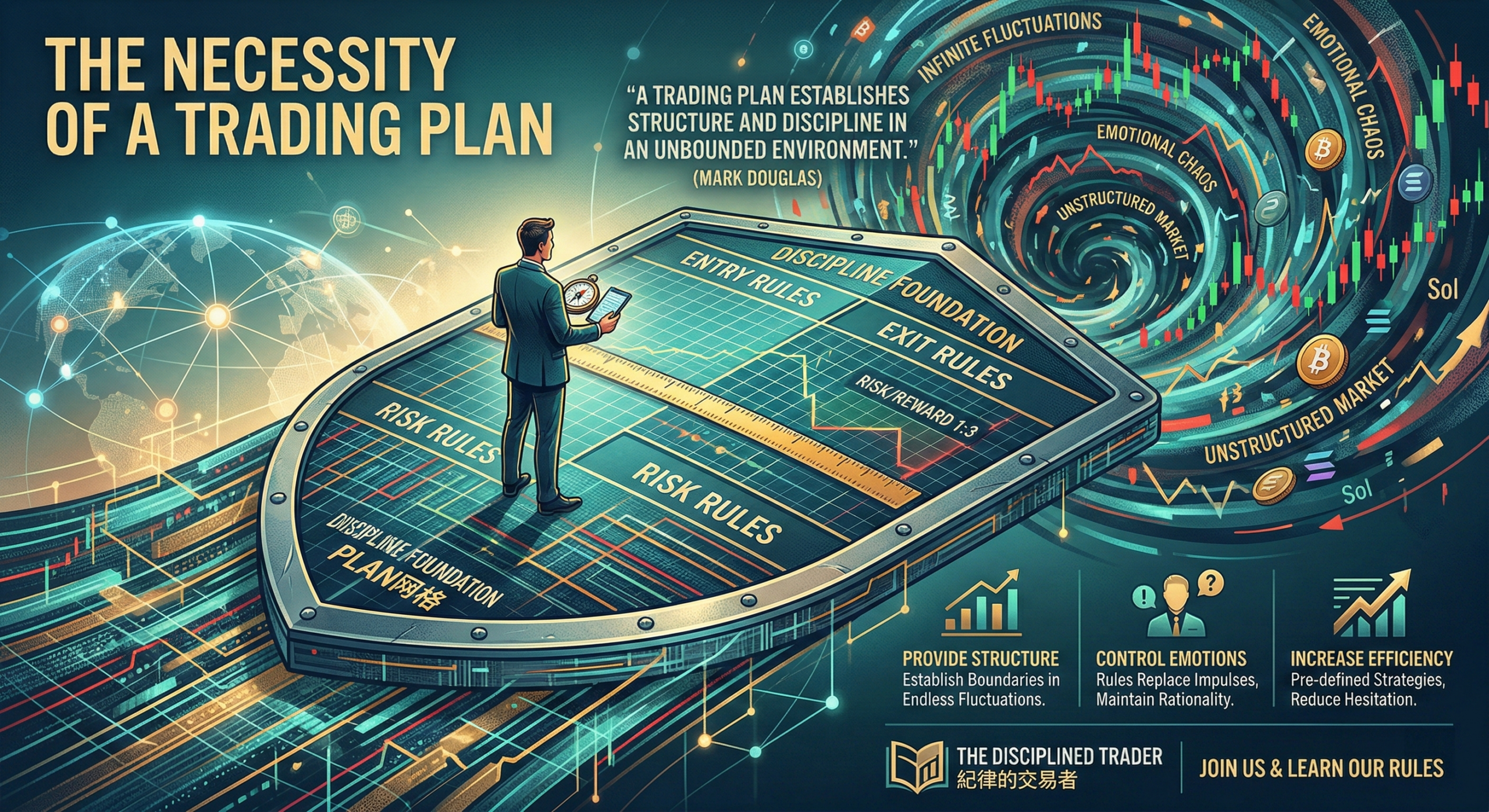 交易計劃包括入場、出場和風險規則。道格拉斯強調,這能應對連續波動,維持紀律。我後來制定明確計劃,如風險比率1:3,並嚴格執行。這在加密市場的連續波動中有效,防止情緒主導。計劃不僅保護資金,還強化心理,讓你專注於執行而非反應。